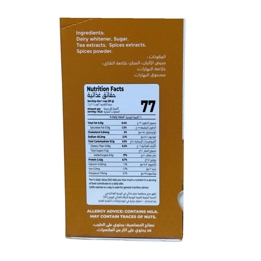 مزيج قوي وعطري من الشاي الفوري والتوابل الهندية التقليدية، يقدم لك شاي كاراك غني بالتوابل في كل كوب. سهل التحضير – ما عليك سوى إضافة الماء الساخن للحصول على مشروب دافئ ولذيذ بنكهة ماسالا قوية.